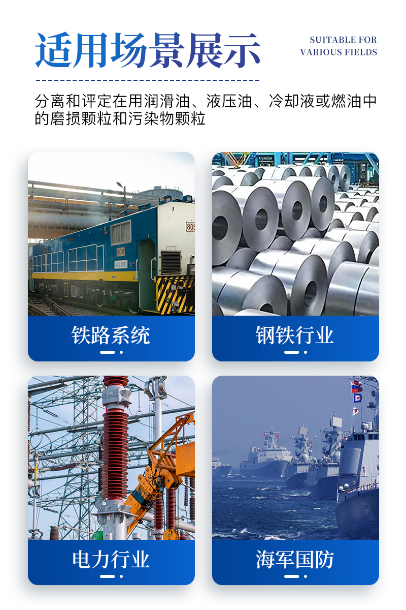 (14)應用范圍:用以分離和評定在用潤滑油、液壓油、冷卻液或燃油中的磨損顆粒和污染物顆粒;